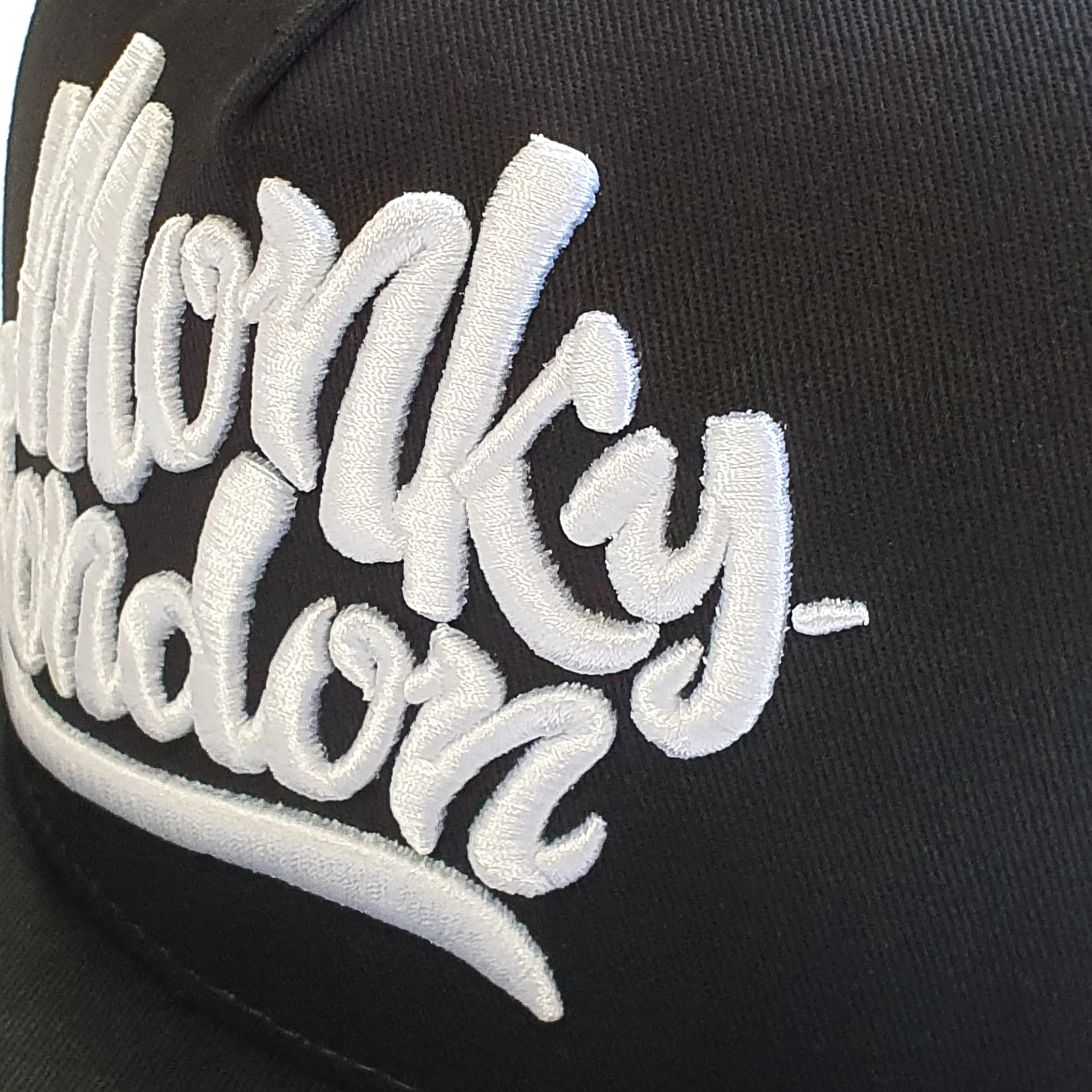 Super sick high quality five panel 100% cotton twill black cap featuring 3D embroidered traditional Monky London white front logo, 2D embroidered Monky face white side logo for extra John action, 2D embroidered Monky London white rear logo & velcro rear adjuster complimented with cheeky rubber Duggits tag, proper pimp!