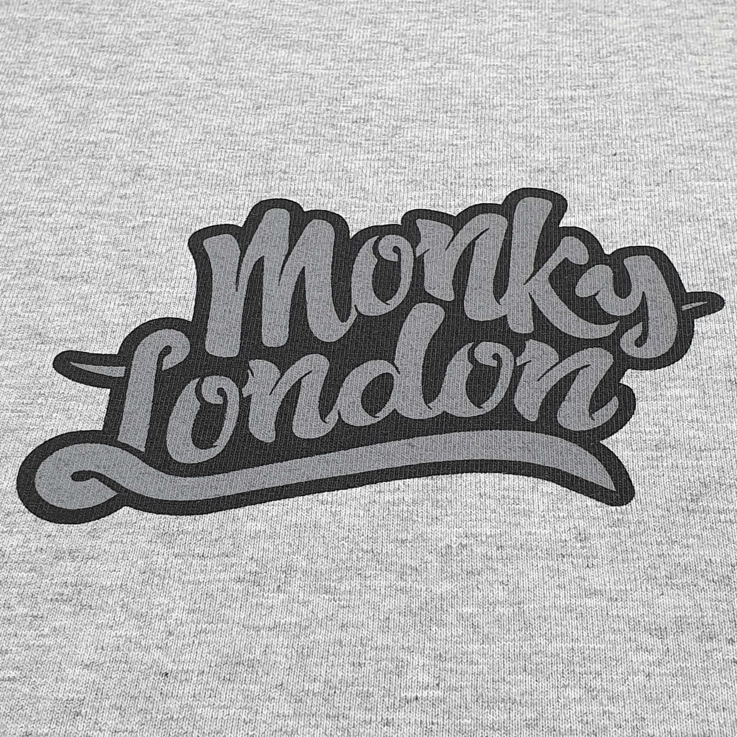 Highest quality organic 100% ringspun cotton T shirt featuring subtle classic Monky London stealth grey front logo with black boarder / background. Proper Legit cheeky Monky black rear logo & Monky London inside black neck logo. Ultimate classic Monky goodness for those who like a subtle power increase!