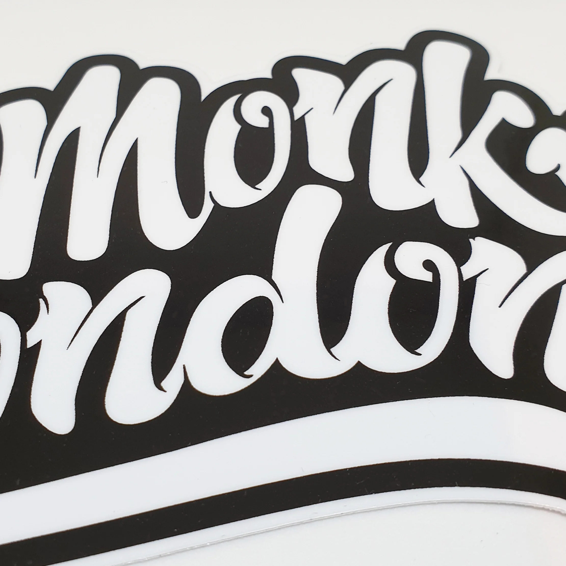 DETAILS â Monky London die cut plastic vinyl sticker! Features the classic Monky London calligraphic logo with black background and white boarder. Classic ultimate Monky pimpness!