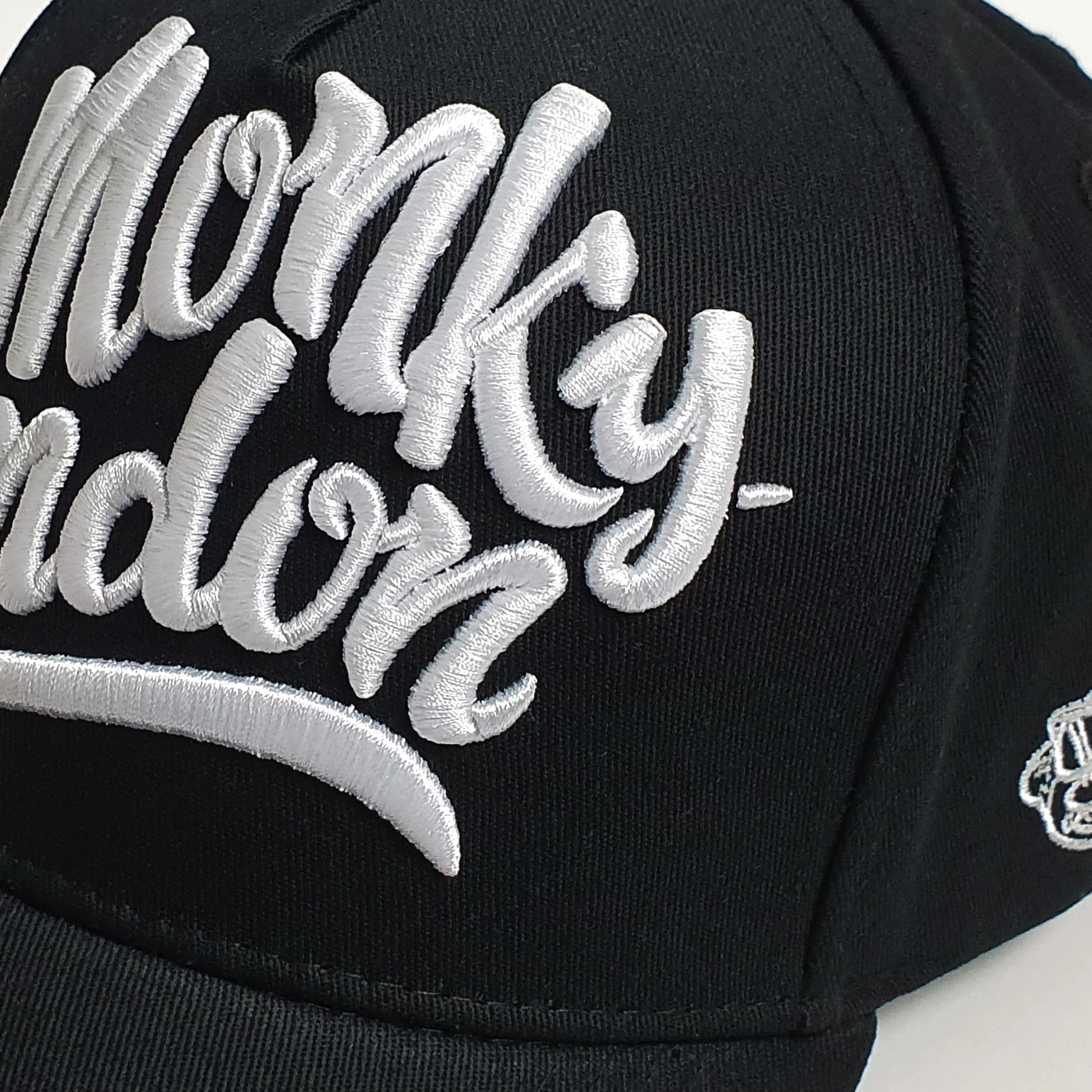Super sick high quality five panel 100% cotton twill black cap featuring 3D embroidered traditional Monky London white front logo, 2D embroidered Monky face white side logo for extra John action, 2D embroidered Monky London white rear logo & velcro rear adjuster complimented with cheeky rubber Duggits tag, proper pimp!